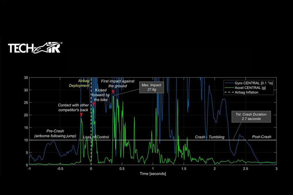 Dann kippt die Situation abrupt. Die Sensoren markieren klar den Kontakt mit Malcolm Stewart. Innerhalb von Millisekunden steigen Rotations- und Beschleunigungswerte stark an – der Punkt, an dem Barcia die Kontrolle verliert, ist in den Daten eindeutig zu erkennen. Nicht der Boden ist der Auslöser des Sturzes, sondern der Kontakt in der Luft.