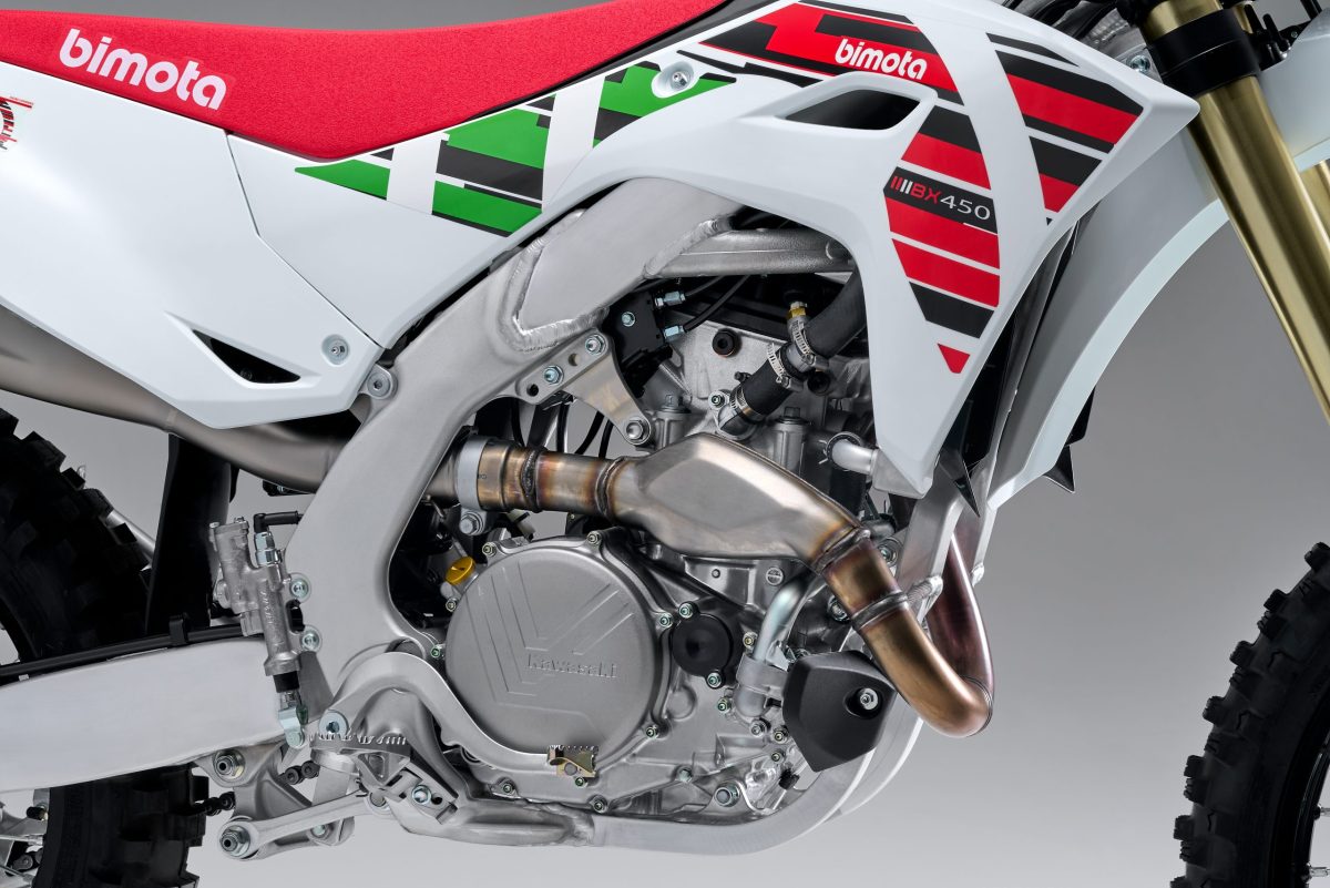 Die BX450 basiert auf der KX450X – mit 449-ccm-Viertaktmotor, Aluminiumrahmen und erprobter Offroad-Technik. Bimota übernimmt diese Plattform, passt sie an und ergänzt sie um eigene Komponenten und ein eigenständiges Gesamtsetup.
